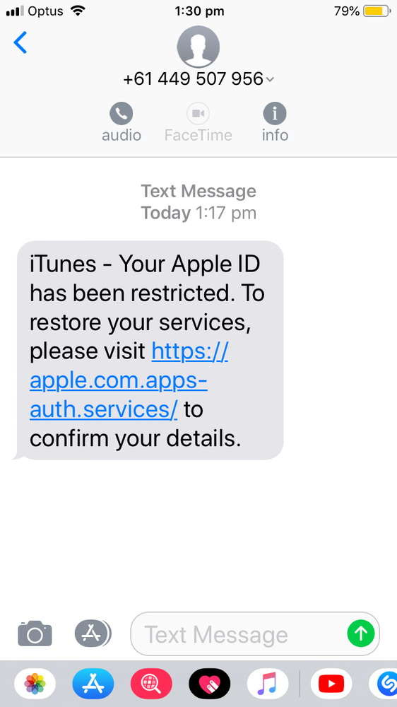 Coincidentally I received this fake SMS, otherwise known as Smishing. The glee for me was that it didn't show "Apple" as the sender, but an actual number!