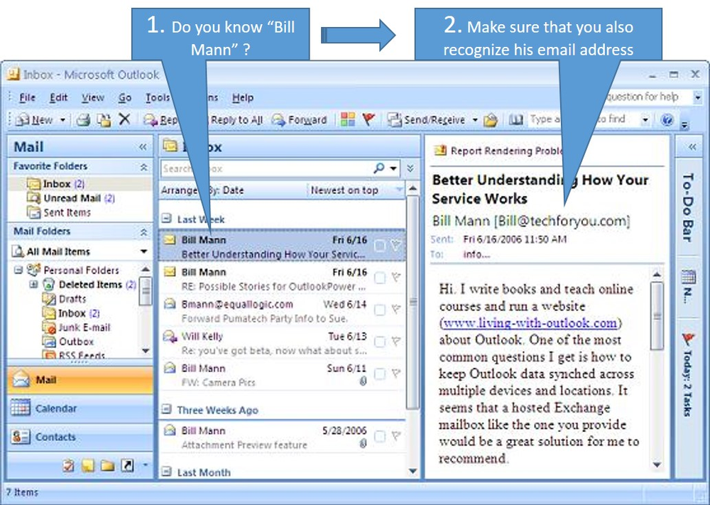 1.“Preview Pane” must be opened Train your users to operate their email, whether it is the typical Microsoft Outlook or a web browser based Gmail or Yahoo account, with the “preview pane” opened. This simple technique not only identifies the user but also the actual email sender. Please see the diagram below. If you don’t recognise the email address, please have IT investigate. Additionally, it may indicate that it was sent by a 3rd party email sender, such that it will show “Bill Mann [ Bill@bulkemail.com on behalf of Bill@techforyou.com] – alert IT again if it seems suspicious. Please also consider a broader security training awareness program for groups of staff or all employees.